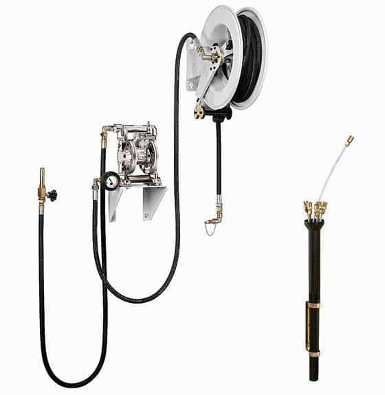 Vægmonteret spildoliesuger med membranpumpe, der gør det muligt ved hjælp af sonder, at dræne motorkøretøjer og aflevere olien i en tønde eller tank. Kan bruges til olie, spildolie, kølevæske osv.